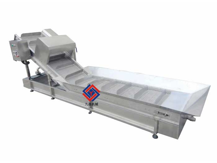 本機主要用于蔬果提升和清洗前的預洗,提升處安裝有噴淋裝置,可以減少進(jìn)入洗菜機的清洗時(shí)間,下面安裝有接水盤(pán)和和水泵,它們是收集水和讓水循環(huán)使用的作用。是蔬果加工配套設備的主要輔助機械。